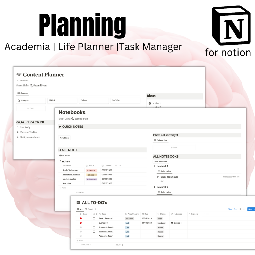 The ultimate productivity tool for organizing your life, work, and academic goals. This all-in-one planner includes a life planner, work planner, and academic planner, providing a comprehensive solution for managing your tasks and staying on top of your priorities.